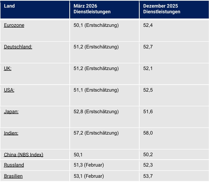 Unter Zugrundelegung der aktuellen Einkaufsmanagerindices (Sentiment-Indikatoren, Frühindikatoren, Scheidewert zwischen Wachstum und Kontraktion 50 Punkte) als Bewertungsmaßstab ergibt sich in der westlichen Welt zum Ende des 1. Quartals 2026 ein positives, aber weniger dynamisches Gesamtbild als vor dem Beginn des Irankriegs. Japan führt mit 52,5 Punkten im gesamtwirtschaftlichen Zuschnitt (Composite Index) bezüglich der westlichen Industrienationen oder Industrieregionen, gefolgt von den USA mit 51,4 Zählern vor dem UK mit 51,0 Zählern und der Eurozone mit 50,5 Punkten. Unter den bedeutenden Wirtschaftsnationen der Welt rangiert Indien weiter auf dem ersten Rang mit 56,5 Punkten. Chinas Composite Index stellte sich auf 50,5 Zähler.