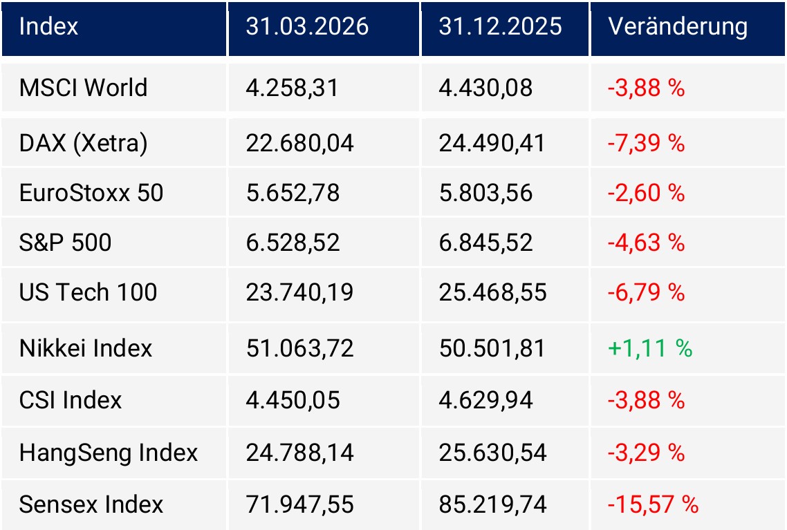 Das Winterquartal war an den Aktienmärkten zweigeteilt. Bis zum 27. Februar fielen Rekorde, unter anderem bei dem DAX, dem S&P 500 oder dem Nikkei-Index. Bereits ab Ende Januar standen Tech- und AI-Werte unter Druck. Die „Tech- und AI Story“ wurde in Frage gestellt.      Mit dem Beginn des Irankriegs brachen die Aktienmärkte dann ein, um Ende März leichte Erholungstendenzen zu zeigen. Der MSCI-World Index verlor im Quartalsvergleich 3,88 %.      Der DAX gab um 7,39 % nach. Der EuroStoxx 50 verlor lediglich 2,60 %. US-Märkte standen unter Verkaufsdruck. So verzeichnete der S&P 500 ein Minus in Höhe von 4,63 %. Der US-Tech 100 fiel um 6,79 %.